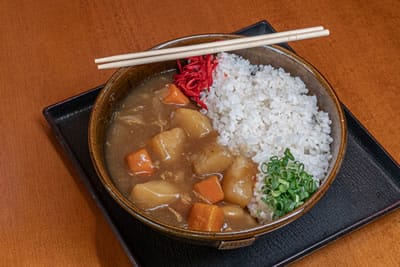Curry de carne ou vegetariano. Acompanha missoshiru e gyoza (à vontade).