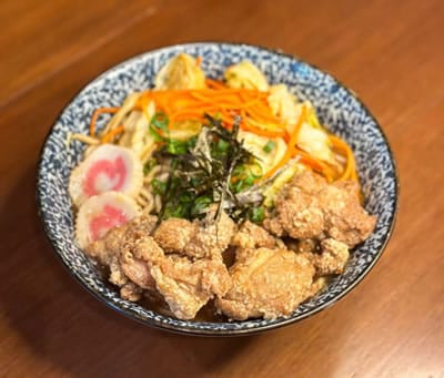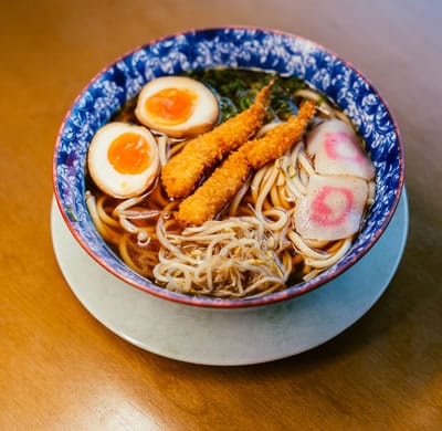 Udon com caldo à base de peixe e kombu, ajitsuke tamago, cebolinha, naruto, camarão empanado e moyashi. Acompanha missoshiru, gyoza (à vontade) e choux cream feito com farinha de amêndoas e creme légère (baunilha, chocolate ou matchá).