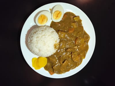 Arroz japonês com curry de carne suína e legumes.