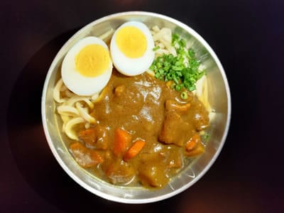 Udon com curry de carne suína e legumes.