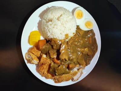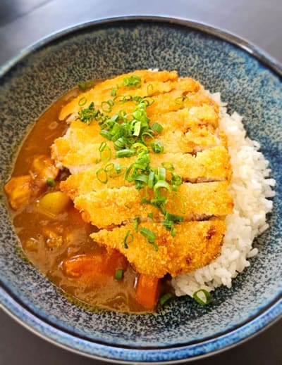 Lombo de porco empanado acompanhado de arroz japonês e curry levemente picante.