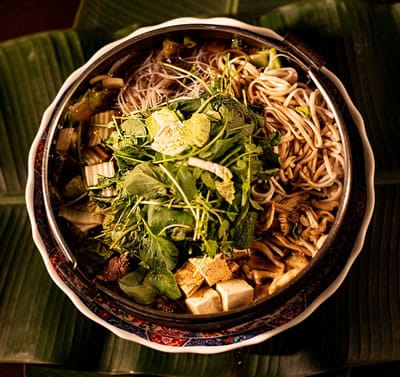 Cozido de carne, legumes variados, shimeji, tofu e macarrão japonês temperados com manteiga e shoyu.