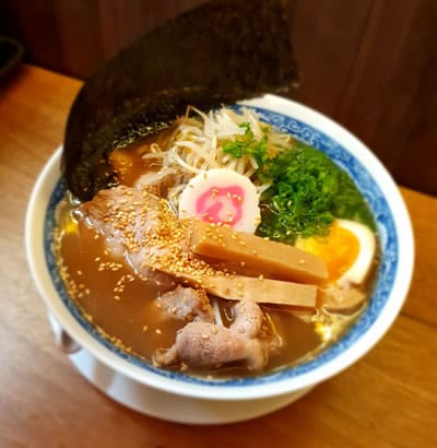 Caldo à base de tutano suíno, manteiga e shoyu cozido por 12h, macarrão artesanal, karaague, naruto, legumes salteados, cebolinha e alga nori.