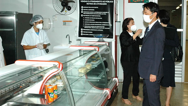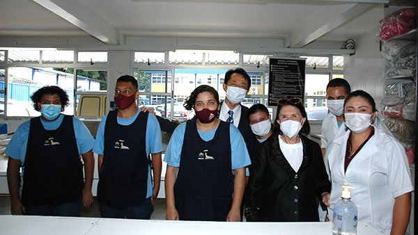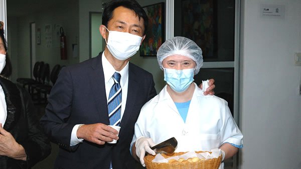 Concluída a cerimônia, a comitiva conheceu os trabalhos da APAE-DF. Em um ambiente limpo, bem organizado e distribuído em setores/oficinas, todos os aprendizes realizam tarefas desde o atendimento ao público, na recepção, preparar e servir alimentos, manter limpo e organizado o refeitório, lavanderia e lanchonete. O Embaixador Hayashi observou com mais atenção o trabalho realizado na limpeza e higienização de livros e documentos.